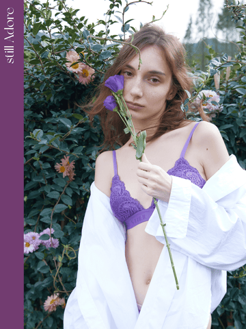 the Meadow Violet stretch lace gives the bralette a shining effect, and the elastic under band offers support and a soft skin feeling.  Double slim adjustable shoulder straps provide sexy and soft support.  Back G-hook closure with two hook.